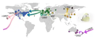 L'espèce a été introduite au Maghreb, en Islande, en Amérique du Nord (où elle est désormais répandue et commune du Canada au Nord du Mexique[5]), à Hawaï, aux Bermudes, en Australie et en Nouvelle-Zélande[6].