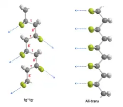 Structure du PVDF dans deux conformations différentes. Les sphères jaunes représentent les atomes de fluor. Dans les deux cas, le polymère possède une polarisation électrique ; elle est alignée avec l'axe de la molécule dans la conformation dite tg+tg (gauche), et perpendiculaire à l'axe dans la conformation all-trans (droite).