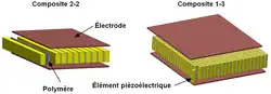Un composite piézoélectrique (ou piézocomposite) est formé de deux constituants également appelés « phases » : une phase piézoélectrique (souvent une céramique de PZT) et une phase non piézoélectrique (typiquement une résine époxy). Un composite est défini par l'arrangement géométrique entre les deux phases. Les plus courants sont composés de bâtonnets de piézocéramique plongés dans la résine (composites notés 1-3) ou de couches empilées (composites notés 2-2). Les notations 1-3 et 2-2 font référence à la connectivité de chacune des deux phases[33]. En jouant sur la connectivité et les fractions volumiques des deux phases, il est ainsi possible d'ajuster de manière quasi-continue les propriétés piézoélectriques et mécaniques de l'ensemble. En particulier, les composites ont montré leur intérêt par rapport aux céramiques conventionnelles dans le domaine des transducteurs acoustiques hautes fréquences pour l'imagerie : leur meilleur coefficient de couplage électromécanique et leur impédance acoustique plus adaptée permettent d'améliorer la résolution des images[28],[34].