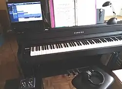 - ↑ Les touches des claviers électroniques basiques sont de simples interrupteurs à ressort, et n'ont pas toujours la largeur standard des claviers de piano. Les claviers dits « lourds », beaucoup plus chers, permettent de se rapprocher des véritables pianos d'étude, a fortiori lorsque ces claviers commandent des systèmes électroniques et informatiques performants.