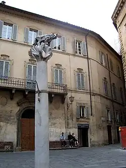 Une colonne au centre de la place porte l'emblème de la ville : la Lupa senese.