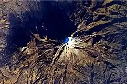 Vue du volcan depuis la Station spatiale internationale mettant en évidence le relief et le cratère sommital.