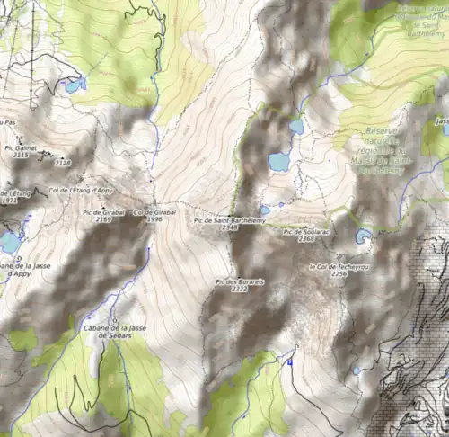 - À partir du vallon du Lasset (au nord-ouest) via les Gourgs (étangs) et le col du Trou de l'Ours.