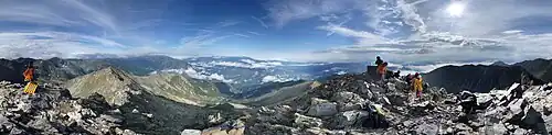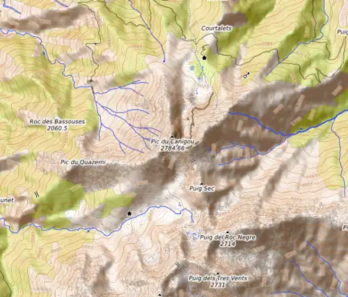 Le pic du Canigou se trouve sur un axe orienté nord-sud allant du pic Joffre (2 362 m) au nord jusqu'au puig dels Tres Vents (2 731 m) au sud.