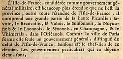 , sur books.google.fr, (consulté le ) : « L'Île-de-France, considérée comme gouvernement général militaire, est beaucoup plus étendue que ne l'est la province ; outre toute l'étendue de l'Île-de-France, il comprend une grande partie de la haute Picardie : à savoir, le Beauvaisis, le Valois, le Soissonnais, le Noyonnais et le Laonnois », p. 481 - 1 2 Pierre-Nicolas Grenier, Introduction à l'histoire générale de la province de Picardie, , 610 p. (lire en ligne), p. 6