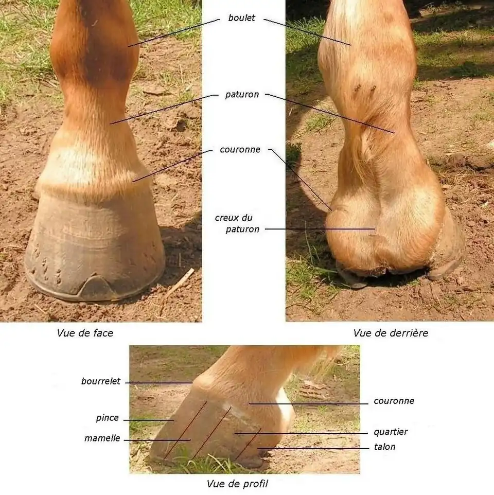 L'extrémité des membres du cheval est composé, de haut en bas, du canon (vertical), de l'articulation du boulet et de son fanon, poils plus longs situés à l'arrière du boulet. Le pied à proprement parler comporte le paturon, la couronne et le sabot[19]. La couronne se termine par le bourrelet périoplique ou bourrelet principal. Le périople est une bande de corne un peu plus molle, situé au bord supérieur de la paroi, et se confond en arrière avec la fourchette. Il sécrète un vernis (le périople) protégeant la corne du dessèchement[19]. Le bourrelet principal, au niveau de la couronne, sécrète la corne constituant la paroi du sabot. La pousse de la paroi se fait donc de haut en bas[5].