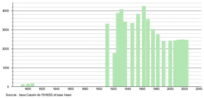 L'évolution du nombre d'habitants est connue à travers les recensements de la population effectués dans la commune depuis 1793. Pour les communes de moins de 10 000 habitants, une enquête de recensement portant sur toute la population est réalisée tous les cinq ans, les populations de référence des années intermédiaires étant quant à elles estimées par interpolation ou extrapolation[22]. Pour la commune, le premier recensement exhaustif entrant dans le cadre du nouveau dispositif a été réalisé en 2006[23].