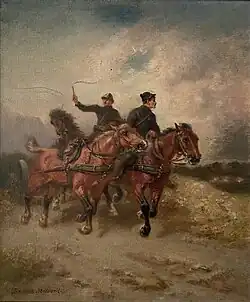 En tant que peintre, il ne se spécialise pas vraiment mais peint essentiellement des sujets militaires et des animaux[2],[6],[3]. À ceux-ci, il faut ajouter des représentations moyenâgeuses, puis des scènes de genre avec notamment Place de l'Étape à Fontainebleau que L'Abeille de Fontainebleau décrit comme « une vue exacte et très claire de la place »[6]. Il peint entre autres des scènes équestres (tout comme Paul Tavernier et le comte Jean de Cossé-Brissac) et expose de nombreuses scènes de chasse[4],[3]. En outre, il compose quelques tableaux d'histoire[7]. Bien que faisant apparaître les éléments avec exactitude dans ses représentations, il ne se contente pas de copier le modèle mais cherche à attirer l'attention sur ses personnages[4],[8].