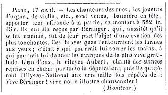 Béranger est adoré par les chanteurs et musiciens des rues de Paris qui lui rendent hommage au nombre de 800 en 1848. Il est l'ami de leur doyen et syndic Aubert.
