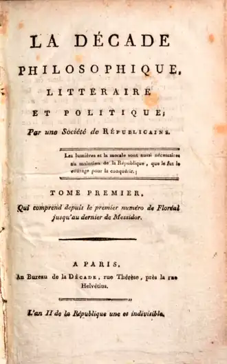 - 1 2 Joanna Kitchin, Un journal « philosophique » : La Décade, 1794-1807, Paris, F. Paillart, , 315 p. (lire en ligne), p. 265.