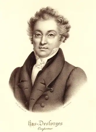 - ↑ Les biographes ont donné erronément la date de naissance du 14 mars, mais son acte de baptême à la paroisse Saint-Louis précise : « L’an mil sept cent soixante treize et le vingt quatre mars est né et a eté baptisé par moi soussigné, Pierre Louis Hus des Forges, fils de Louis, musicien, et d’Anne Marchand, son épouse. »