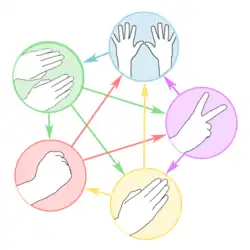 Une telle relation à cinq, chacun étant dominé par deux autres et dominant deux autres, se trouvait déjà dans le Wuxing chinois, les cinq éléments.