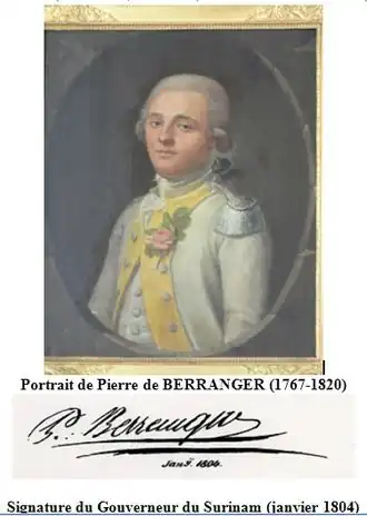 Il est pourtant qualifié par les Anglais en 1804 de « pro-French »… et toutes les relations de cet épisode de l’histoire du Surinam montrent la position alors très difficile de Pierre Berranger : alors que la population de la colonie est majoritairement favorable à se placer sous la protection de l’Angleterre, plutôt que de rester sous l’influence de leur propre gouvernement batave, devenu vassal de la France républicaine, le Gouverneur est tiraillé entre sa loyauté envers le Gouvernement des Pays-Bas et son hostilité à la République française…