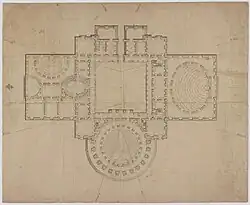 Au cours de cette période controversée, en février 1792, Andrew Ellicott, qui a réalisé l'arpentage initial des limites du futur District de Columbia et de Federal City sous la direction des commissaires, informe ces derniers que L'Enfant n'a pas pu faire graver le plan de la ville et a refusé de lui fournir le plan original (dont il a préparé plusieurs versions)[43],[44]. De plus, L'Enfant laisse entendre qu'il a élaboré des projets de plans pour « Congress House » et « President's House », mais qu'il n'est pas prêt à les partager. Lors d'un voyage à Philadelphie en décembre 1791, son bureau est cambriolé, des croquis et des plans de la ville et des bâtiments publics sont volés.