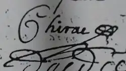 - ↑ Montpellier (Hérault). Archives communales. Paroisse Notre-Dame des Tables. Registres des baptêmes, mariages et sépultures. « L'an mil six cens quatre vingts six & le onzième Jour du mois de Juillet apres la publica(ti)on des trois bans, ont estê conjoincts en legitime Mariage m.r m.re (sic) Pierre Chirac Docteur en l'Universite de medecine de la p(rése)nte ville de Mon(t)p.(elli)er natif de la ville de Conques au Diocese de Rodes (Rodez) et Demoiselle Claire Issert natifve de lad(it)e ville de mon(t)p.(elli)er, ont esté p(rése)nts S.r Pierre Deidier m(aîtr).re Chirurgien et Jean Cabrier marchant mangonnier (marchand de poissons au détail) signés avec les parties et moy curé ». Signé Chirac, Claire Issert, Deidier, Deidier, J. Cabrier, J. Pignon curé.