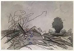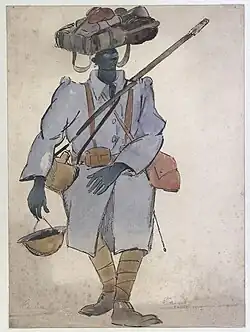 Néanmoins, les dessins de Pierre Falké constituent aussi un témoignage réaliste et fidèle, parfois tragique, du premier conflit mondial. Lorsqu’il est mobilisé pour la Bataille de la Somme en 1916, l’artiste croque ainsi la mort et le quotidien des tranchées. C’est le cas du Grenadier, œuvre dont l’artiste était visiblement fier puisqu’elle est proposée à l’achat lors d’une vente aux enchères à Drouot en 1920[5]. Enfin, comme beaucoup d’artistes ayant connu le front de 1914, il est intrigué par les soldats africains venus des colonies françaises, dont il représente les traits et la tenue.