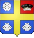 D'azur, à la croix d'or, accostée en chef de deux roses d'argent et en pointe de deux coquilles du même.[7] |