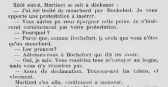 Un mois plus tard, le 10 juin, Martinet participe à un meeting sur le boulevard Barbès en compagnie de Faure et Gustave Leboucher[45]. Lors de ce meeting, qui réunit aussi des socialistes et d'autres mouvances, il entre en conflit avec le socialiste Gustave Rouanet, qui l'a accusé d'être un informateur[45]. Celui-ci est alors à la tribune, fait un discours sur le fait que les socialistes ne chercheraient pas à amputer la liberté, puis se fait prendre à partie par Martinet, qui lui demande de répéter devant lui ce qu'il aurait dit au conseil municipal de Paris, où il l'aurait qualifié de « mouchard »[46]. Les deux se battent ensuite quand Martinet et d'autres anarchistes montent sur la tribune ; Rouanet est renversé et écrasé au sol par le tumulte - il s'enfuit rapidement[45]. Le fait que les chaises volent dans la pièce brise les lampes et provoque une obscurité importante dans la réunion. L'anarchiste est alors pris à partie par plusieurs personnes, qui le battent en retour - il sort de la salle le visage en sang en criant « Vive l'anarchie »[46]. Dès qu'il sort de la salle, il est arrêté par la police et incarcéré[46].