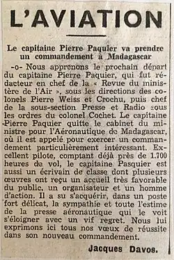 La fonction de Pierre Paquier l'amène à accueillir des aviateurs ayant accompli des actions extraordinaires, tels le chanteur millionnaire Harry Richman et son pilote Dick Merrill arrivant de Londres après avoir leur étonnant « ping pong flight »[8]. Les volumes vides des ailes et du fuselage de leur Vultee V-1 étaient emplies de 41000 balles de ping pong, censées le faire flotter en cas d'amerrissage forcé.