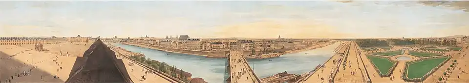 - 1798 : Vue de Paris depuis les Tuileries ou Paris, vue prise du pavillon du milieu des Tuileries, inaugurée en juillet 1799 dans la première rotonde construite à Paris au début de l'an VII (hiver 1798-1799) dans l'ancien enclos du couvent des Capucines, rue Neuve-des-Capucines, renommé « jardin d'Apollon »[2]