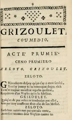 - Rousset, Pierre. Grizoulet, lou Joloux otropat et los omours de Floridor et Olimpo, de Roselas et d'Omelito, et de Grézoulet et lo morgui, coumedio. Sorlat [Sarlat] : Coulombet, 1694.