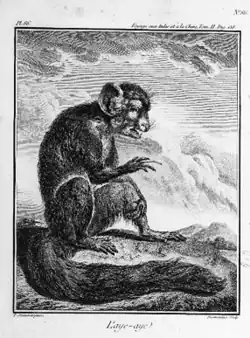 Le aye-aye est un petit primate, nommé actuellement Daubentonia madagascariensis. « Il a cinq doigts à chaque pied... Les deux dernières articulations du doigt du milieu sont longues, grêles, dénuées de poils ; il s'en sert pour tirer des trous des arbres les vers qui font sa nourriture »