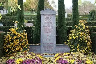 En 1920, au sortir de la guerre, l'hôtel familial de la rue Oudinot est vendu et Coubertin s'installe définitivement en Suisse, d'abord à Lausanne en 1922, puis à Genève à partir de 1934. Le , alors qu'il vient d'être fait citoyen d'honneur de Lausanne, Pierre de Coubertin, ruiné et avec un fils, Jacques, lourdement handicapé[D 2], s’effondre, victime d'une crise cardiaque dans une allée du parc de La Grange, à Genève, sur la rive gauche du lac Léman. Son corps est enterré à Lausanne au cimetière du Bois-de-Vaux et son cœur est inhumé près du sanctuaire d’Olympie à l’intérieur du monument commémoratif de la rénovation des Jeux olympiques, inauguré en sa présence en 1927[D 4].