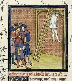 - « Le pueple de Paris sesmut de toutes pars et coururent hommes et femmes après. Car il ne le pouoient croire en nulle manière que homme de si haut estat fust devakl au bas. Le bourreau li mist la corde entour le col et li demanda sil vouloit riens dire et il dist que nenni. Tantost le bourrel osta leschiele et le laissa aller entre les lattons. Nul ne se doit fier en sa grant hautesce ne en son grant estat ; car la roe de fortune qui ne se tient en un point ne en un estat, tantost devale et juis au plus bas. Touz ceulz que Pierre de la Broce avoit mis a court ne de rien avanciés firent boutés hors du service, ne nul nen demoura que len peust savoir ».