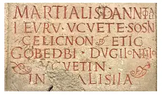 - « IEURU », forme verbale, sans « t » final, donc à la première personne. Le terme était déjà connu au XIXe siècle, notamment sur une inscription gauloise découverte à Nevers et à Auxey, puis en 1840 à Vaison, sous la forme gallo-grecque « ειωρου » + datif + accusatif en « -ov » précédé de « σοσιν », forme que l'on retrouve dans le formulaire de la pierre de Martialis, après UCUETE. Cette forme verbale correspond sans aucun doute au latin « donavit » (a offert / a donné). Dans les inscriptions bilingues, le gaulois emploie la première personne ("je donne") alors que le latin emploie plus souvent la troisième personne ("il a donné"). Il s'agit donc du verbe dont Martialis est le sujet : il a offert quelque chose[1].