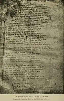 « Memorandum quod Stacy de Rokayle pater willielmi de Langlond qui stacius fuit generosus & morabatur in Schiptoun vnder whicwode tenens domini le Spenser in comitatu Oxoniensi qui predictus willielmus fecit librum qui vocatur Perys ploughman.