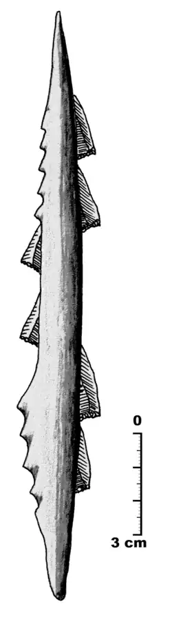 L'interprétation consensuelle actuelle est que les microlithes de forme géométrique étaient utilisés sur des projectiles comme des harpons. |