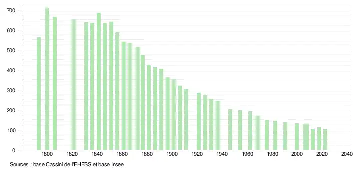 L'évolution du nombre d'habitants est connue à travers les recensements de la population effectués dans la commune depuis 1793. Pour les communes de moins de 10 000 habitants, une enquête de recensement portant sur toute la population est réalisée tous les cinq ans, les populations de référence des années intermédiaires étant quant à elles estimées par interpolation ou extrapolation[17]. Pour la commune, le premier recensement exhaustif entrant dans le cadre du nouveau dispositif a été réalisé en 2007[18].