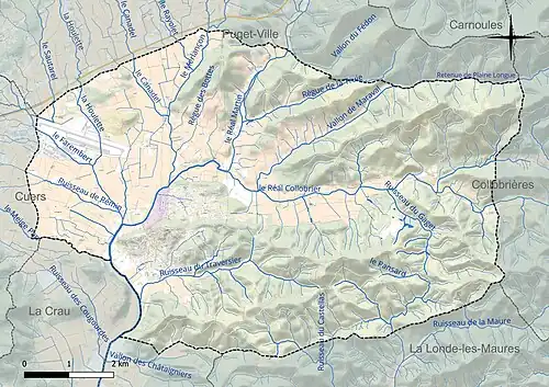 - La commune est arrosée par le Réal Martin, et ses affluents, le Meige Pan, le Farembert, le Merlançon (Réal Martin), le Traversier, le Vallon Loubier et le Réal Collobrier, eux-mêmes respectivement affluent et sous-affluents du Gapeau.