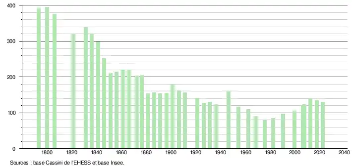 L'évolution du nombre d'habitants est connue à travers les recensements de la population effectués dans la commune depuis 1793. Pour les communes de moins de 10 000 habitants, une enquête de recensement portant sur toute la population est réalisée tous les cinq ans, les populations de référence des années intermédiaires étant quant à elles estimées par interpolation ou extrapolation[22]. Pour la commune, le premier recensement exhaustif entrant dans le cadre du nouveau dispositif a été réalisé en 2007[23].
