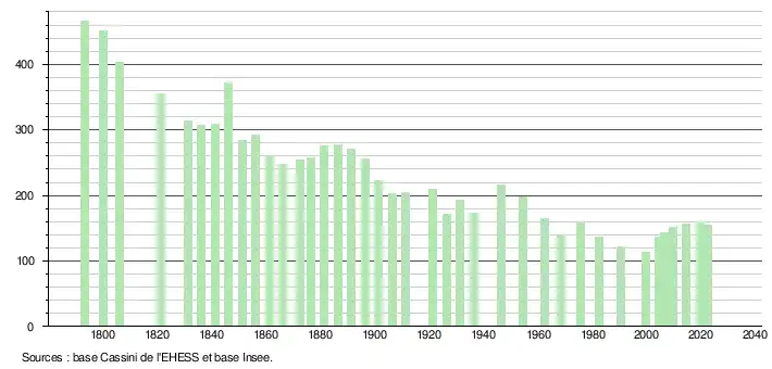 L'évolution du nombre d'habitants est connue à travers les recensements de la population effectués dans la commune depuis 1793. Pour les communes de moins de 10 000 habitants, une enquête de recensement portant sur toute la population est réalisée tous les cinq ans, les populations de référence des années intermédiaires étant quant à elles estimées par interpolation ou extrapolation[25]. Pour la commune, le premier recensement exhaustif entrant dans le cadre du nouveau dispositif a été réalisé en 2004[26].