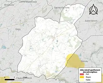 Les mouvements de terrains susceptibles de se produire sur la commune sont des tassements différentiels[15]. Le retrait-gonflement des sols argileux est susceptible d'engendrer des dommages importants aux bâtiments en cas d’alternance de périodes de sécheresse et de pluie[16]. 1,1 % de la superficie communale est en aléa moyen ou fort (54,9 % au niveau départemental et 48,5 % au niveau national)[Carte 2]. Depuis le , en application de la loi ELAN, différentes contraintes s'imposent aux vendeurs, maîtres d'ouvrages ou constructeurs de biens situés dans une zone classée en aléa moyen ou fort[Note 1],[17].