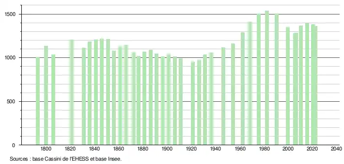 L'évolution du nombre d'habitants est connue à travers les recensements de la population effectués dans la commune depuis 1793. Pour les communes de moins de 10 000 habitants, une enquête de recensement portant sur toute la population est réalisée tous les cinq ans, les populations de référence des années intermédiaires étant quant à elles estimées par interpolation ou extrapolation[17]. Pour la commune, le premier recensement exhaustif entrant dans le cadre du nouveau dispositif a été réalisé en 2005[18].