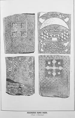 - Classe 2. Pierres de forme plus ou moins rectangulaire avec une grande croix et des symboles sur au moins un côté. Les symboles, tout comme les motifs chrétiens, sont taillés et l'espace de la croix avec son décor est rempli de dessins. La période est du VIIIe au IXe siècle.