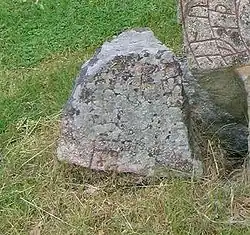 - Traduction : « Et Danr et Húskarl et Sveinn ont érigé la pierre en mémoire d'Ulfríkr, le père de leur père. Il a apporté deux paiements en Angleterre. Puissent Dieu et la Mère de Dieu aider l'âme du père et du fils »[2].