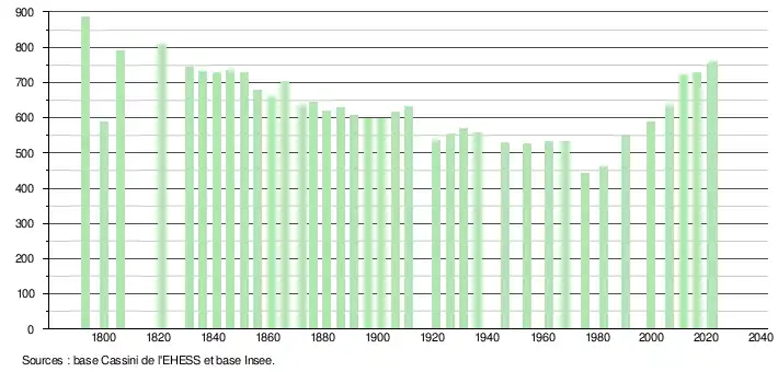 L'évolution du nombre d'habitants est connue à travers les recensements de la population effectués dans la commune depuis 1793. Pour les communes de moins de 10 000 habitants, une enquête de recensement portant sur toute la population est réalisée tous les cinq ans, les populations de référence des années intermédiaires étant quant à elles estimées par interpolation ou extrapolation[29]. Pour la commune, le premier recensement exhaustif entrant dans le cadre du nouveau dispositif a été réalisé en 2006[30].