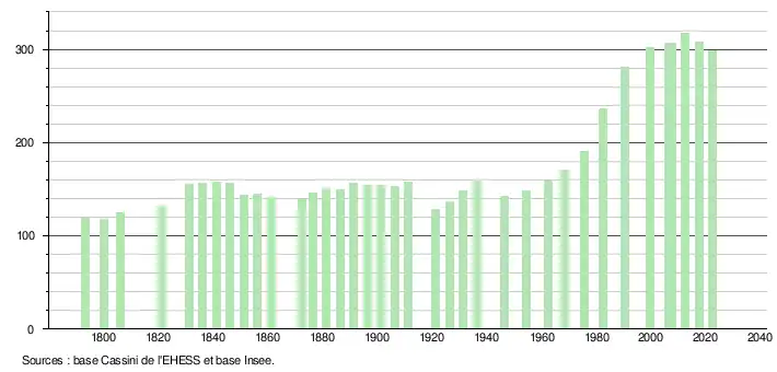 L'évolution du nombre d'habitants est connue à travers les recensements de la population effectués dans la commune depuis 1793. Pour les communes de moins de 10 000 habitants, une enquête de recensement portant sur toute la population est réalisée tous les cinq ans, les populations de référence des années intermédiaires étant quant à elles estimées par interpolation ou extrapolation[19]. Pour la commune, le premier recensement exhaustif entrant dans le cadre du nouveau dispositif a été réalisé en 2007[20].