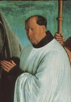 Le commanditaire est représenté, comme à l'habitude de cette époque, dans le tableau même, sur le côté droit et de la même taille que les autres personnages. Il porte un costume de chanoine, comparable à ceux d'autres chanoines se retrouvant dans des miniatures de Fouquet. D'après les traits de son visage, et selon François Avril, il n'a pas atteint l'âge de quarante ans. Il est accompagné, derrière lui, peut-être par son saint patron, sans doute saint Jacques reconnaissable à son bourdon de pèlerin. Par ailleurs, aucun signe ne permet de l'identifier, aucun symbole héraldique notamment[8].