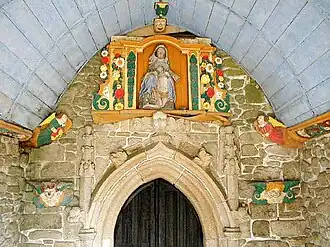 Des anges et des boiseries aux couleurs très vives surmontent les vantaux anciens de la porte.