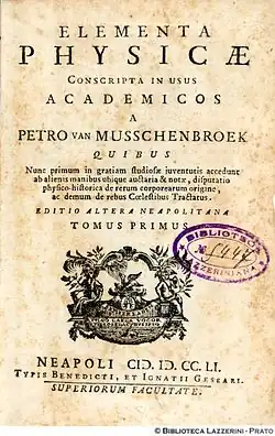 - En 1760 Musschenbroek décide de publier un ouvrage plus complet, en particulier sur la partie concernant l'électricité. Compte tenu de sa mort, intervenue en 1761, la nouvelle édition est terminée par son disciple Johan Lulofs, et parait en deux tomes en 1762 sous le titre de Introductio ad philosophiam naturalem (OCLC 16225246) ;