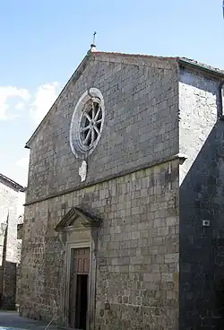 Elle présente une façade à double pente (facciata a capanna) divisée par une corniche horizontale, un portail de style renaissance, une rosace en travertin sous laquelle figure le blason sculpté des Aldobrandeschi, en marbre.