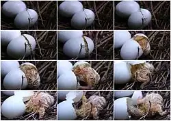 L'incubation dure 17 jours en moyenne et est assurée par les deux parents à tour de rôle, le mâle ne couvant qu'un tiers de la durée de la journée, et généralement de 10 h à 17 h.