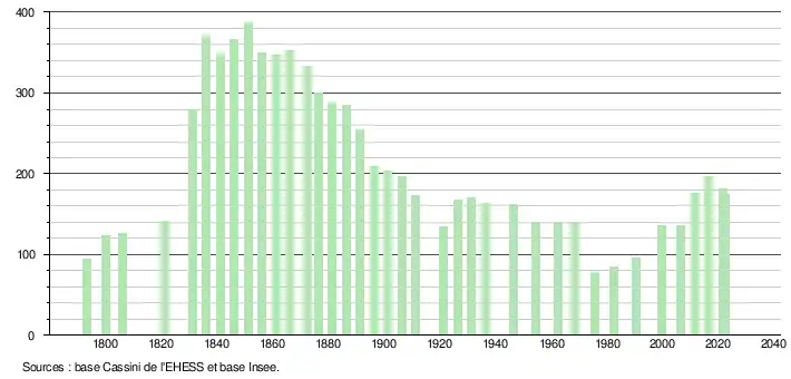 L'évolution du nombre d'habitants est connue à travers les recensements de la population effectués dans la commune depuis 1793. Pour les communes de moins de 10 000 habitants, une enquête de recensement portant sur toute la population est réalisée tous les cinq ans, les populations de référence des années intermédiaires étant quant à elles estimées par interpolation ou extrapolation[23]. Pour la commune, le premier recensement exhaustif entrant dans le cadre du nouveau dispositif a été réalisé en 2006[24].