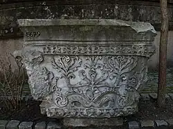 Le décor sculpté de ces deux piliers, notamment le lacis compliqué de vigne recouvrant le chapiteau, a pu se prêter à cette identification orientale, dans la mesure où elle ne paraissait pas pouvoir correspondre à un édifice connu à Constantinople. Le monogramme porté par les piliers fut alors identifié à une inscription latine de dédicace[3].