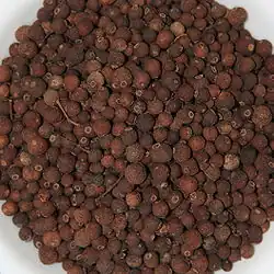 - Le fruit séché constitue le quatre-épices, ainsi nommé parce que cette épice développe plusieurs arômes rappelant le poivre, le clou de girofle, la cannelle et la noix de muscade. Il est très utilisé dans la cuisine polonaise et parfume notamment le bigos. Aux Antilles les graines sont recommandées pour accomoder tous types de viandes et de poissons.