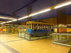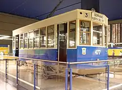D'autre part, il abrite, en référence aux anciens tramways de Madrid, le tram 477. Produit en 1908 par la Société franco-belge La Croyére, suivant le modèle Charleroi II. Il a été rénové en 1935 et 1943 pour assurer son service jusqu'en 1962. Il est remis en état de marche en 1971 pour participer aux commémorations du centenaire du tramway de Madrid avant d'être définitivement remisé en mai 1972 lors de la fermeture du réseau de tramway d'origine de la ville. Cette voiture a été utilisée pour le tournage de plusieurs films et notamment le Docteur Jivago sortie en 1965. Avant d'être exposée dans la station, il la voiture a été restaurée, dans l'atelier des FAC, à Saragosse[5].